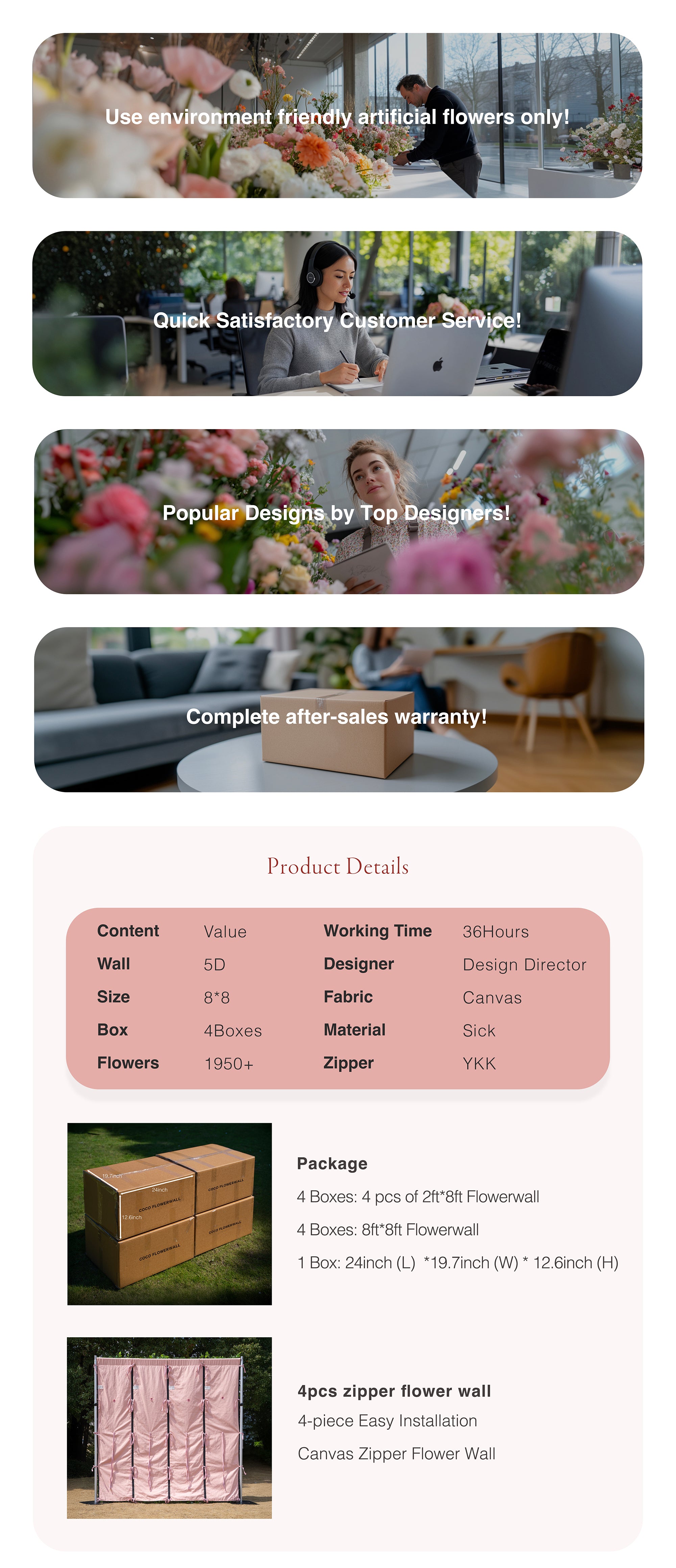 If there are any quality problems, missing products, or package loss for the order, please contact us with pictures and videos of the flower wall in 7 days after you receive the order. We will provide full refund, partial refund or product exchange.Customer Service Email:customer.service@cocoflowerwall.com