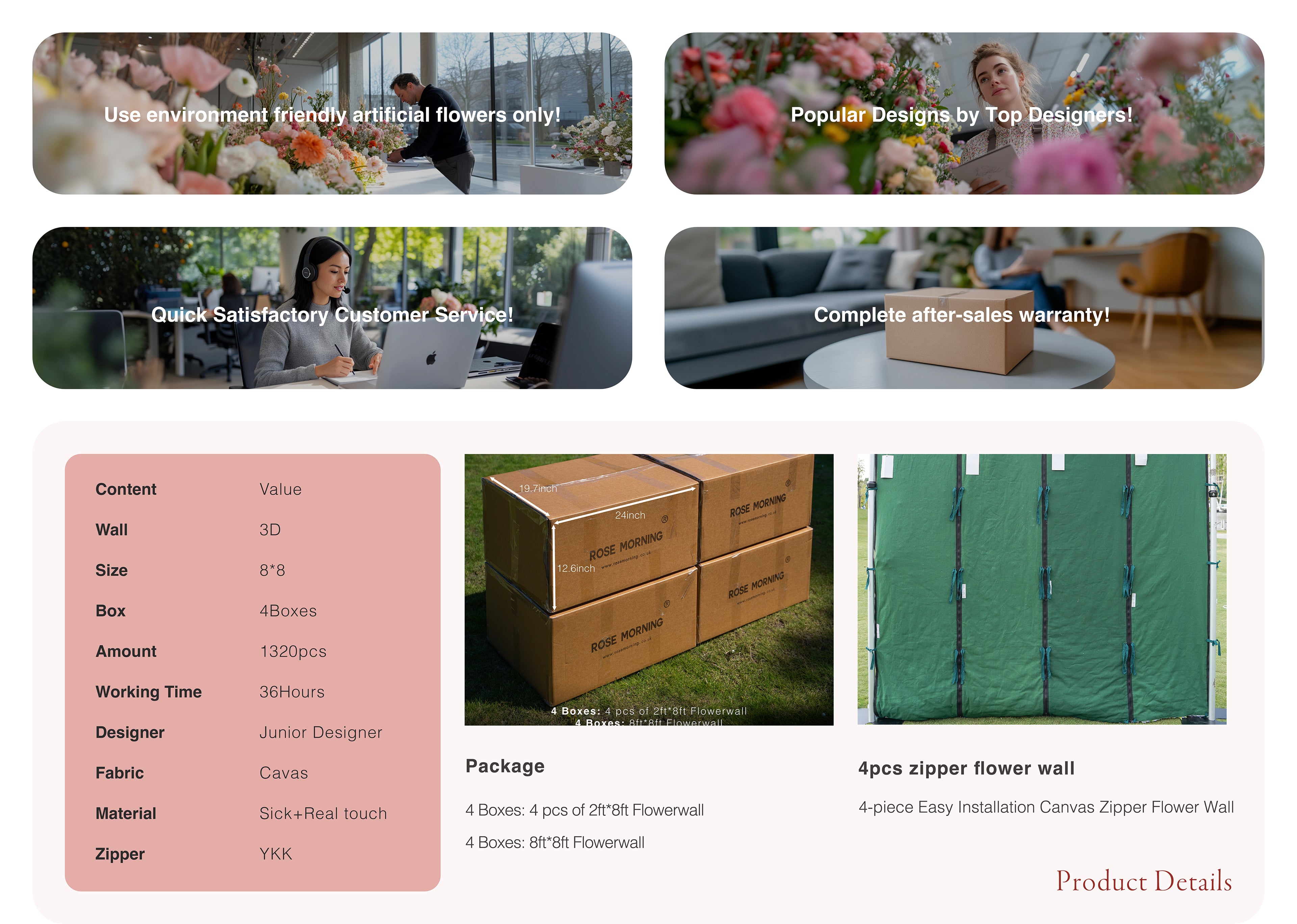 If there are any quality problems, missing products, or package loss for the order, please contact us with pictures and videos of the flower wall in 7 days after you receive the order. We will provide full refund, partial refund or product exchange.Customer Service Email:customer.service@cocoflowerwall.com
