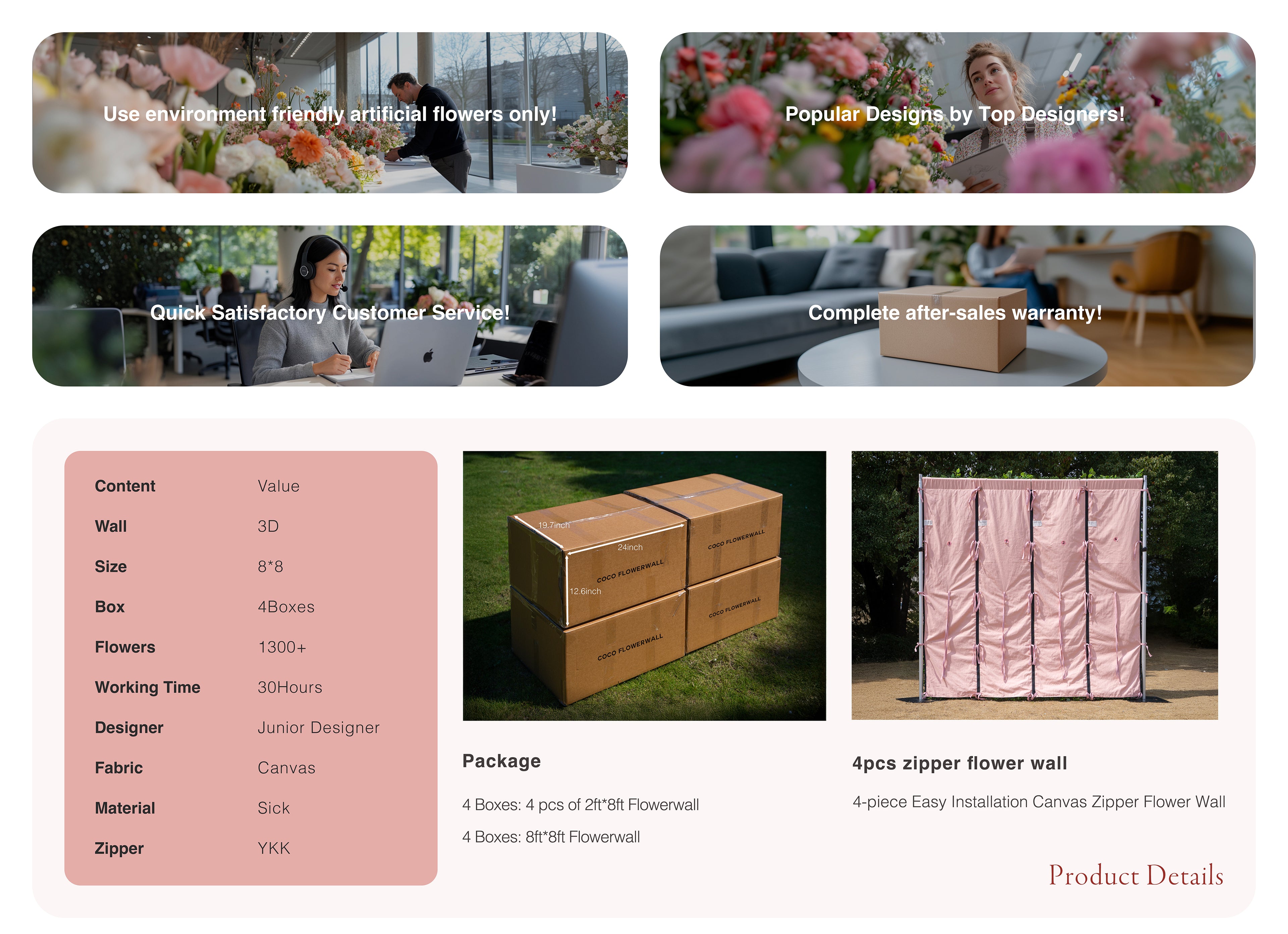 If there are any quality problems, missing products, or package loss for the order, please contact us with pictures and videos of the flower wall in 7 days after you receive the order. We will provide full refund, partial refund or product exchange.Customer Service Email:customer.service@cocoflowerwall.com
