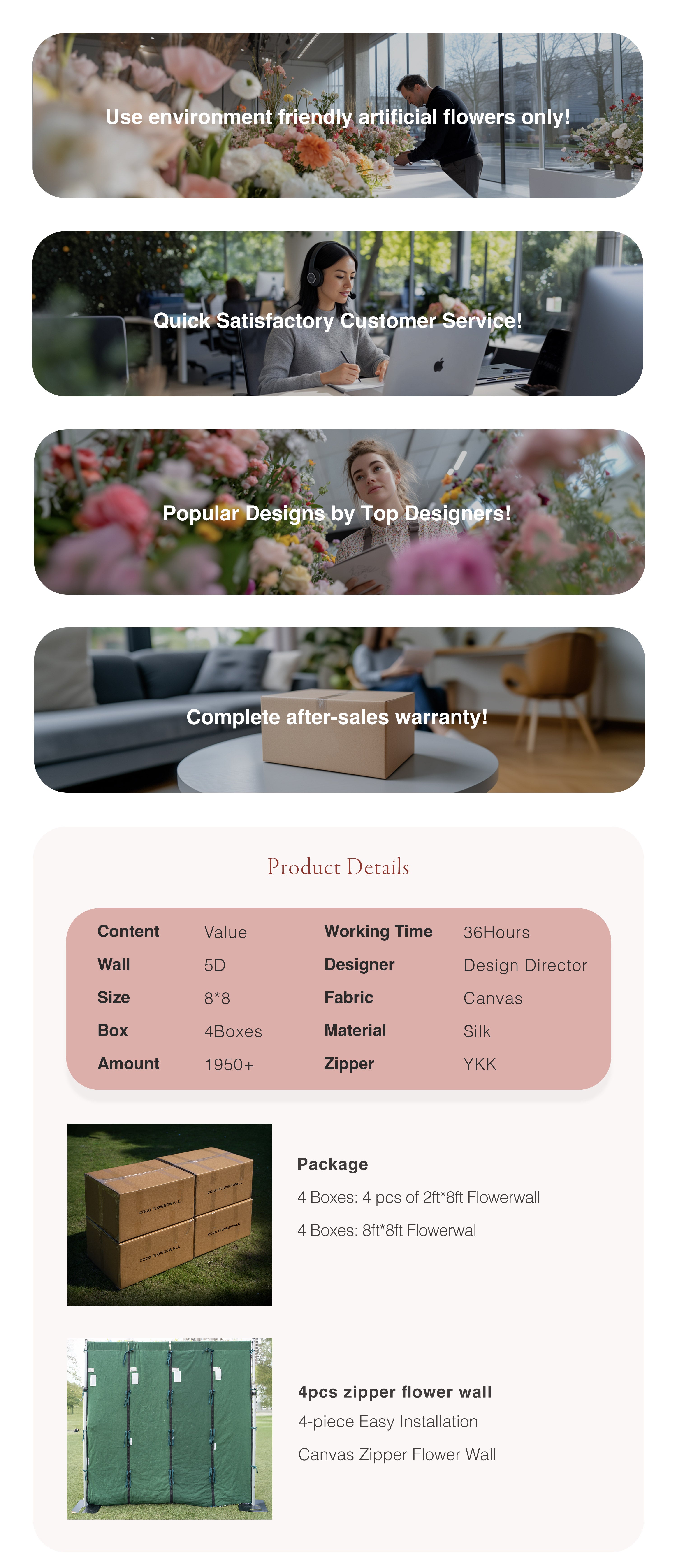 If there are any quality problems, missing products, or package loss for the order, please contact us with pictures and videos of the flower wall in 7 days after you receive the order. We will provide full refund, partial refund or product exchange.Customer Service Email:customer.service@cocoflowerwall.com