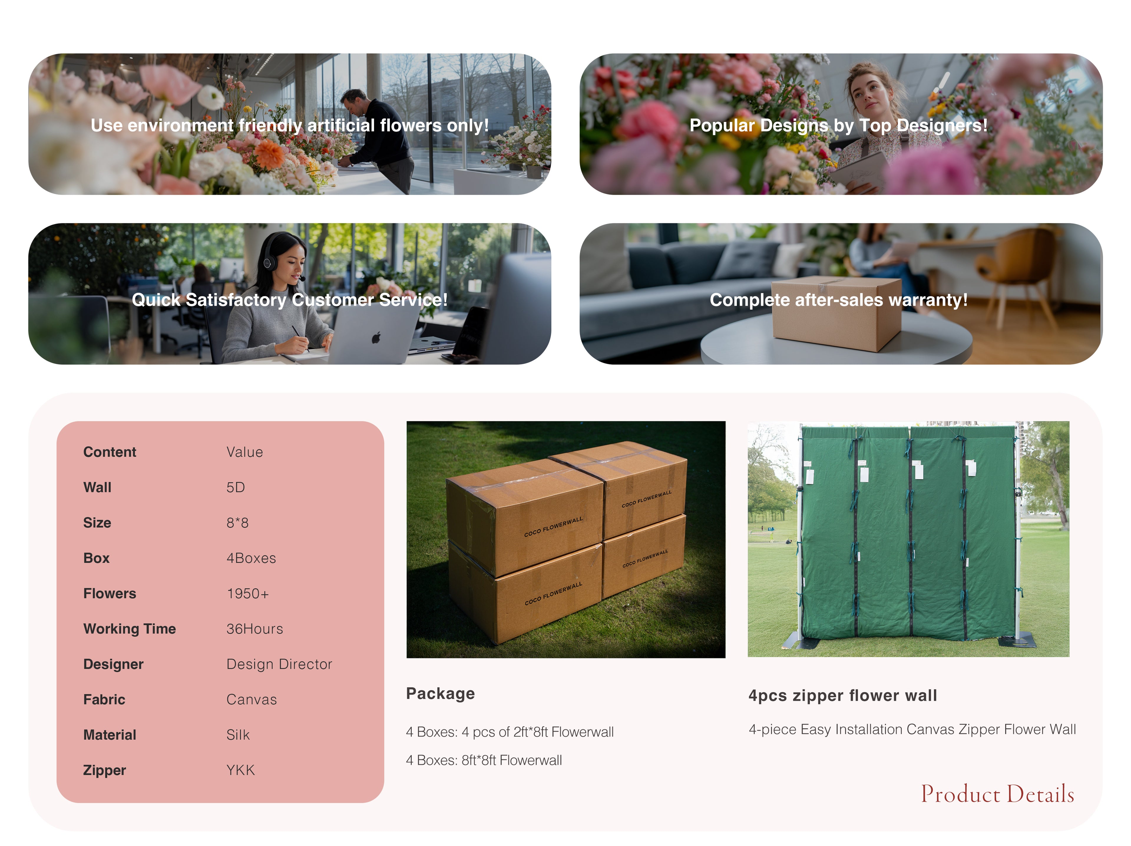 If there are any quality problems, missing products, or package loss for the order, please contact us with pictures and videos of the flower wall in 7 days after you receive the order. We will provide full refund, partial refund or product exchange.Customer Service Email:customer.service@cocoflowerwall.com